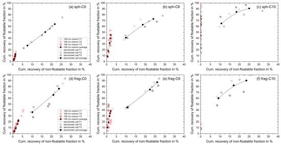 Fuerstenau upgrading curves for the flotation tests in the benchmark mechanical froth flotation cell (black) and the MultiDimFlot apparatus with the 100 cm column (red) using the 6-particle systems: (a) hydrophilic spheres, C0, (b) moderately hydrophobic spheres, C6, (c) strongly hydrophobic spheres, C10, (d) hydrophilic fragments, C0, (e) moderately hydrophobic fragments, C6, and (f) strongly hydrophobic fragments, C10, all mixed with magnetite as the non-floatable fraction. Data points for tests using spheres are represented by a circle, while data points for tests using fragments are represented by a diamond symbol. Filled points with a dashed line are average values (where lines were added to guide the eye), and single points are the individual experiment runs. Each data point corresponds to the cumulative recovery after defined flotation times.