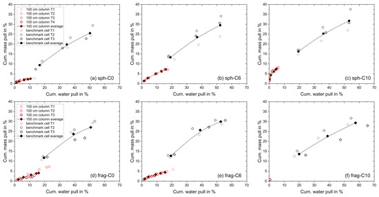 Cumulative mass versus water pull diagrams for the flotation tests in the benchmark mechanical froth flotation cell (black) and the MultiDimFlot apparatus with the 100 cm column (red) using the 6-particle systems: (a) hydrophilic spheres, C0, (b) moderately hydrophobic spheres, C6, (c) strongly hydrophobic spheres, C10, (d) hydrophilic fragments, C0, (e) moderately hydrophobic fragments, C6, and (f) strongly hydrophobic fragments, C10, all mixed with magnetite as the non-floatable fraction. Data points for tests using spheres are represented by a circle, while data points for tests using fragments are represented by a diamond symbol. Filled points with a dashed line are average values (where lines are added to guide the eye), and single points are the individual experiment runs. Each data point corresponds to the cumulative mass or water pull after defined flotation times.