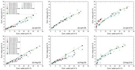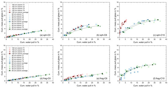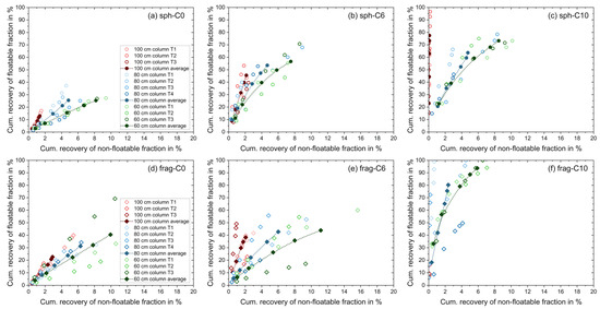 Cumulative mass pull of glass particles only versus water pull diagrams for the flotation tests in the MultiDimFlot apparatus with the 100 cm column (red), 80 cm column (blue) and the 60 cm column (green) using the 6-particle systems: (a) hydrophilic spheres, C0, (b) moderately hydrophobic spheres, C6, (c) strongly hydrophobic spheres, C10, (d) hydrophilic fragments, C0, (e) moderately hydrophobic fragments, C6, and (f) strongly hydrophobic fragments, C10, all mixed with magnetite as the non-floatable fraction. Data points for tests using spheres are represented by a circle, while data points for tests using fragments are represented by a diamond symbol. Filled points with a dashed line are average values (where lines are added to guide the eye), and single points are the individual experiment runs. Each data point corresponds to the cumulative mass or water pull observed after defined flotation times.