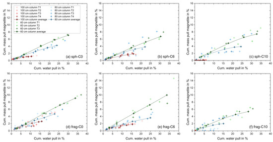 Cumulative mass pull of magnetite only versus water pull diagrams for the flotation tests in the MultiDimFlot apparatus with the 100 cm column (red), 80 cm column (blue) and the 60 cm column (green) using the 6-particle systems: (a) hydrophilic spheres, C0, (b) moderately hydrophobic spheres, C6, (c) strongly hydrophobic spheres, C10, (d) hydrophilic fragments, C0, (e) moderately hydrophobic fragments, C6, and (f) strongly hydrophobic fragments, C10, all mixed with magnetite as the non-floatable fraction. Filled points with a dashed line are average values (where lines are added to guide the eye), and single points are the individual experiment runs. Each data point corresponds to the cumulative mass or water pull observed after defined flotation times.