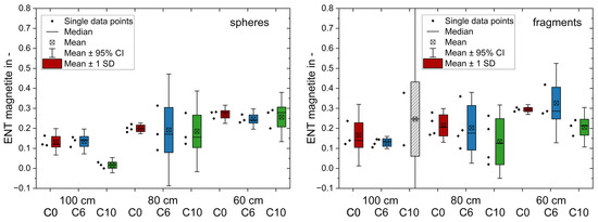 Entrainment factor, ENT, of the non-floatable fraction magnetite for the flotation tests in the MultiDimFlot apparatus with the 100 cm column, the 80 cm column and the 60 cm column using spheres (left) and fragments (right) as the floatable fraction with increasing hydrophobicity from C0 (red) to C6 (blue) to C10 (green). The ENTs of the tests using C10 fragments in MultiDimFlot are marked in grey, because only two tests worked out (others failed due to froth collapse), which makes the use of statistical analysis difficult.