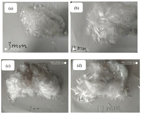 The fibers used in the experiment: (a) Polypropylene—3 mm length; (b) Polypropylene—12 mm length; (c) Glass—3 mm length; (d) Glass—12 mm length.