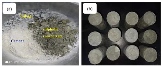 Pyrite or its associated minerals constitute a significant mineral resource; however, pyrite mining operations generate substantial quantities of sulfur tailings. The presence of sulfide causes oxidation reactions to produce a certain amount of acidic liquid. Moreover, sulfur tailings are stacked on the surface, which results in pollution to the environment and adversely affects the stability of the tailings dam [1,2]. Currently, the main mining methods include the caving method, the open stope method, and the backfill mining method. Among these mining methods, the backfill mining method plays a dominant role in orebody recovery. This method can not only safely and efficiently recover underground orebody resources but also can effectively deal with the environmental pollution caused by sulfur tailings [3,4]. When preparing suitable backfill, attention should be paid to the transportability of the material and the maintenance of the specified strength characteristics [5]. Meanwhile, research findings indicate that the presence of sulfide within the tailings exerts a significant impact on the uniaxial compressive strength (UCS) of the backfill, resulting in internal crack propagation during later stages [6,7].