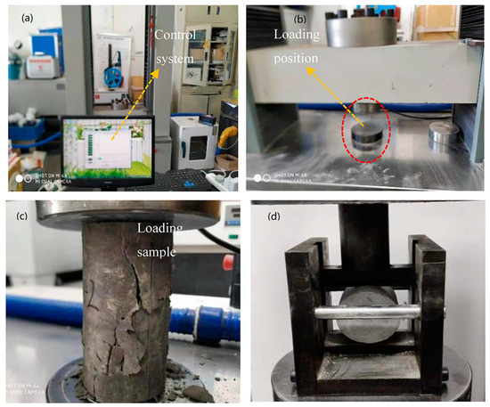 Experimental loading equipment: (a) control interface; (b) loading frame; (c) compressed sample; (d) split sample.