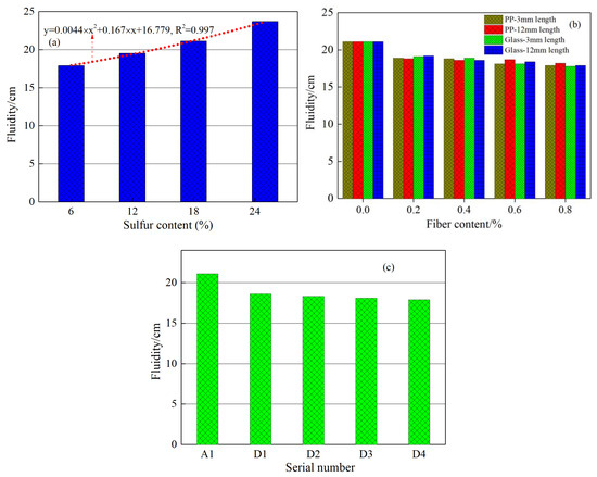 The fluidity parameters of tailings slurry were tested with NLD-3 mortar fluidity tester, the fluidity of slurry was evaluated according to the test method specified in GB/T 2419-2005 “Determination Method of Cement Mortar Fluidity”, and the changing characteristics of slurry flow performance were revealed. Figure 5 illustrates the fluidity of the no-fiber-addition group, the single-type fiber-addition group, and mixed fiber-addition group. From Figure 5a, there is a noticeable correlation between the rise in sulfur content and the increase in fluidity. This phenomenon can be attributed to the higher density of sulfide concentrate when compared to tailings. With a constant mass concentration, an increase in sulfide concentration results in a reduced volume fraction of the sulfur tailings slurry, thereby contributing to an enhancement in flow performance [9]. Figure 5b shows that the fluidity shows a trend of continuous decrease as fiber content increases, which illustrates that the addition of the two fibers exerts an adverse effect on the fluidity. In addition, when both types of fibers are added in a mixed manner, its fluidity parameters are similar to those with the separate addition of the two fibers. This illustrates that the adding method does not affect the flow performance of slurry; this is shown in Figure 5c.