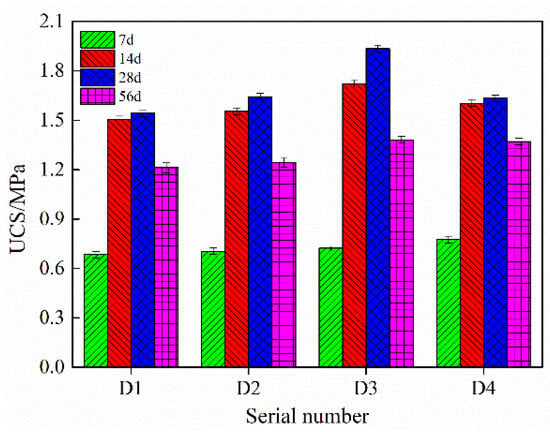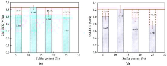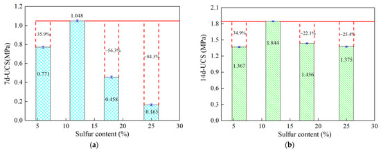 Figure 6 illustrates the relationship between UCS and the curing age. In Figure 6, the numbers on the bar chart represent the specific value of the UCS, while the percentages represent the magnitude of the increase or decrease in the UCS of the CSTB. The UCS of CSTB exhibits an increasing trend followed by a decreasing trend, reaching its maximum at a sulfur content of 12%. Moreover, the impact of sulfur content on the UCS of CSTB is significantly different in different curing ages. As observed in Figure 6, an increase in sulfur content from 6% to 12% resulted in strength enhancements of 35.9%, 34.9%, 19.4% and 12.3% for samples at different curing ages (7, 14, 28 and 56 days). However, when the sulfur content increased from 12% to 25%, the strength of samples decreased by 84.3%, 25.4%, 21.3% and 41.6%, respectively. Therefore, when within the critical value range (7 and 14 days), an increase in sulfur content enhances the strength of CSTB. However, beyond the critical range, an elevated sulfur content leads to a substantial reduction in both the early and late strength of CSTB.
