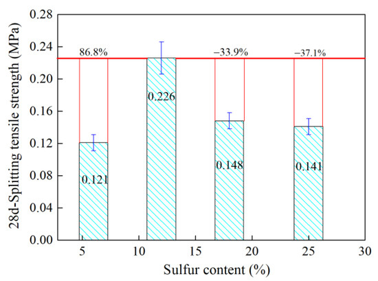 Here, samples with a curing period of 28 days were selected for analysis. Figure 7 illustrates the variation of STS of CSTB at various sulfur content levels. In Figure 7, the numbers on the bar chart represent the specific value of the STS, while the percentages represent the magnitude of the increase or decrease in the STS of the CSTB. This indicates that the STS exhibits a similar trend to the compressive strength, reaching its maximum value at a sulfur content of 12%. It increased by 86.8% prior to reaching a sulfur content of 12%. However, thereafter, a decrease of 37.1% was observed. Therefore, within a certain range, an increase in sulfur content is beneficial for improving the splitting tensile strength. However, it also results in the loss in STS of CSTB when it reaches the critical sulfur content value. The findings of this experiment align with the research conclusions of other scholars [9,14] regarding the UCS and STS characteristics of CSTB. This consistency signifies the reliability of the test’s research outcomes.