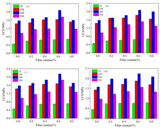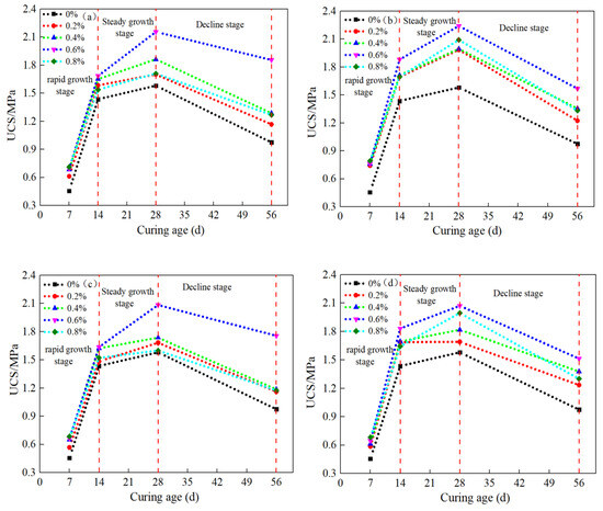 Figure 17 presents the impact of the curing age on the UCS of FRCSTB. In Figure 17, the UCS of FRCSTB decreases after initially increasing with increasing fiber content. In addition, according to the strength growth curve of FRCSTB, the strength growth of CSTB can be categorized into three stages:
