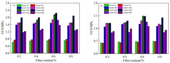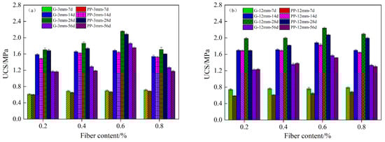Figure 9 illustrates the correlation between the UCS of FRCSTB and the fiber length. Similarly, Figure 10 displays the relationship between the UCS of FRCSTB and fiber type. In Figure 9a, the UCS of FRCSTB with glass fiber added at 7 days, 14 days and 28 days increases as the fiber length increases, considering various fiber content levels. In Figure 9b, the UCS of FRCSTB with polypropylene fiber added at 14 days and 28 days also increased as the fiber length increased with 0.4% and 0.8% fiber content. However, at 56 days, the UCS of FRCSTB with glass fiber or polypropylene fiber decreased, as the fiber length increased with 0.6% fiber content, which may be caused by the fiber entangling and cohesive agglomeration. Therefore, the augmentation of fiber length contributes to the enhancement of mechanical characteristics in FRCSTB. However, the fiber content, fiber uniform distribution and fiber type also influence the effect of fiber length. As shown in Figure 10, it is evident that the UCS of FRCSTB with glass fiber surpasses that of FRCSTB with polypropylene fiber across different fiber contents and lengths, underscoring the significance of fiber type in shaping the mechanical behavior of FRCSTB. This discrepancy can be attributed to the superior tensile strength and elastic modulus exhibited by glass fibers in comparison to polypropylene fiber, thereby rendering glass fiber more effective in reinforcing the FRCSTB [27].