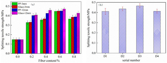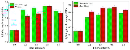 Figure 13 shows the relationship between the STS of FRCSTB and the fiber type and fiber addition method. In Figure 13a, glass fiber is more beneficial for improving tensile strength under the conditions of various fiber contents. Especially, when the fiber length is 12 mm, the CSTB with added glass fiber exhibits higher tensile strength. Therefore, the addition of high-performance fiber is very important.