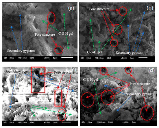 SEM was employed to examine the microstructure characteristics of CSTB and FRCSTB. Figure 14 illustrates the microstructure of CSTB at various sulfur contents after a curing age of 14 days. It can be seen that, with sulfur content increasing, significant changes occur in the hydration products and pore structure. In terms of pore structure, as the sulfur content increases, it initially decreases and then increases, reaching its maximum at a sulfur content of 12%. This can also explain the reason for the decrease in strength due to excessive sulfur content. For 6% sulfur content, C–S–H gel microaggregates and elongated cubic secondary gypsum can be identified, but no observable nearly prism-shaped acicular ettringite is present. For 12% sulfur content, hydration products are visible everywhere, and the presence of slender cube shaped secondary gypsum can still be observed. Finally, a significant amount of gypsum and ettringite was generated when sulfur content exceeded 18%. Once the pyrite in the CSTB was exposed to air and water, an oxidation reaction occurs, leading to the formation of acid and sulfate (Equation (1)). The formation of acid can contribute to C–S–H gel decalcification, resulting in the reduction in existing hydration products, thereby weakening the strength of the CSTB [28]. At the same time, a sustained response occurs in oxide, C3A and Ca(OH)2, resulting in the formation of the expanded phase products, ettringite and secondary gypsum (Equations (2) and (3)). The growth and expansion of the swelling phase product leads to the compression of the surrounding hydrated product structure in CSTB, resulting in increased tensile stress within the material. When the cohesion between the hydration products is not enough to resist tensile stress, obvious cracks will occur inside the CSTB (Figure 14c), which reduces the strength [29,30]. Hence, within the range of 6% to 12% sulfur content, the formation of secondary gypsum, resulting from pyrite oxidation, contributes to decreased porosity and the enhanced compactness of CSTB. This leads to improved UCS and STS of CSTB. However, when sulfur content exceeds 12%, the excessive secondary gypsum causes the CTSB to expand in volume, thus weakening the UCS and STS of CSTB [30]. In addition, excessive acid and sulfate leads to a large reduction in the quantity of C–S–H gel when sulfur content exceeds 12%, resulting in an obvious pore structure inside the CSTB (Figure 14d), which also reduces the mechanical properties of the CSTB [28,31].