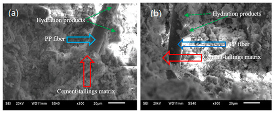 Figure 15 shows the surface SEM images of polypropylene fiber and glass fiber inside the CSTB. In Figure 15, the hydration products are scattered on the fiber surface, intertwining with mortar and forming adhesion, which enhances the strength of FRCSTB. Meanwhile, the process of hydration produces compounds that effectively occupy the gaps between the fiber and cement–tailing matrix, thus further improving the bonding force between the fiber and mortar matrix. Therefore, the stress is dispersed by the fibers in the fiber-reinforced CSTB when the samples are subjected to uniaxial loading, thus improving the mechanical properties and effectively controlling the deterioration of the strength of the CSTB in later stages.