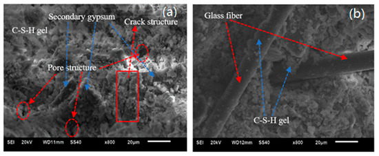 Moreover, the fibers effectively inhibit the propagation of cracks, as shown in Figure 16. There are obvious pore and crack structures in the CSTB samples without fiber and hydration products, such as sub-gypsum and C-S-H gel, which are also produced on the surface of the samples. In Figure 16b, there are no obvious cracks and pore structures inside the CSTB containing glass fiber. This observation indicates that fiber can effectively prevent the formation and expansion of pores and cracks, thereby enhancing the physical properties of the CSTB.