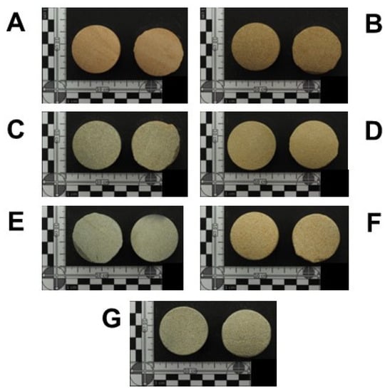 Photographs of plug samples: Torrey Buff (A), Bandera Brown (B), Carbon Tan (C), San Saba (D), Berea Spider (E), Salt Wash North (F), and Castlegate (G).