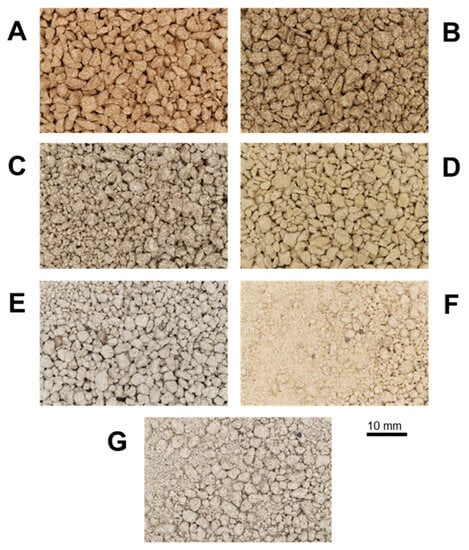 Photographs of pseudo-cuttings: Torrey Buff (A), Bandera Brown (B), Carbon Tan (C), San Saba (D), Berea Spider (E), Salt Wash North (F), and Castlegate (G).