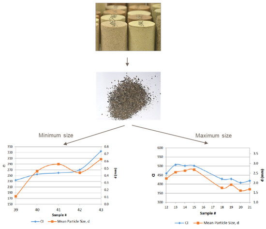 Process evaluation of pseudo-cuttings generation from plugs. The particle size distribution plots represent the minimum and maximum obtained sizes based on the coarseness index (CI) and mean particle size (d), defined for several cutting samples (“Sample #”) produced during drilling [26].