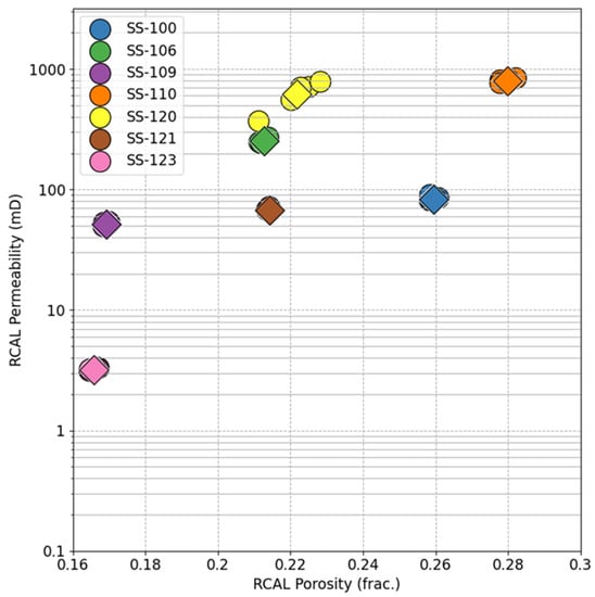 The porosity and permeability results obtained from the plug samples (Table 2) demonstrate a range of values, including relatively low porosity (<0.17 porosity fraction) and low permeability (<10 mD), medium porosity (<0.3 porosity fraction) and permeability (<100 mD), as well as high porosity (>0.3 porosity fraction) and permeability (>100 mD). It is also observed that, for each plug sample, there is minimal variability in porosity and permeability, and the reproducibility of measurements using RCAL was consistently excellent after conducting five measurements on each plug (Figure 4), with the exception of sample SS-120 (Salt Wash North).