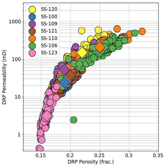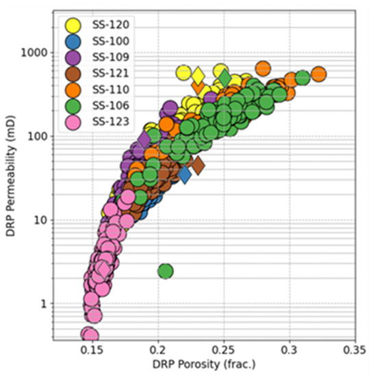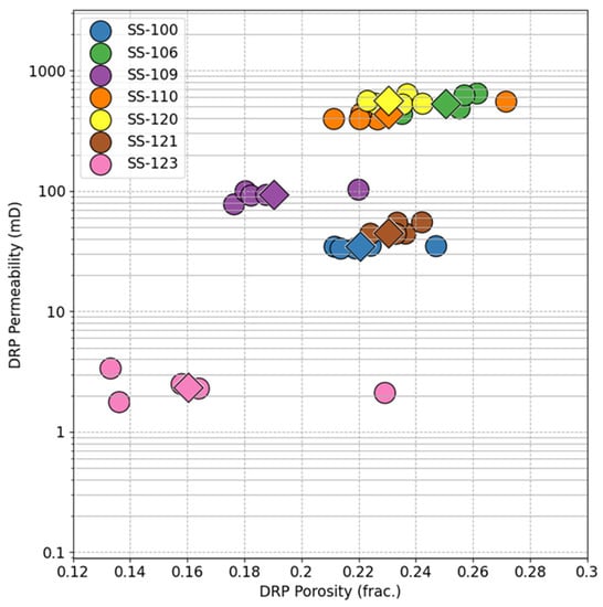Porosity and permeability results from DRP analysis on pseudo-cuttings. Average values are represented by diamond symbols.