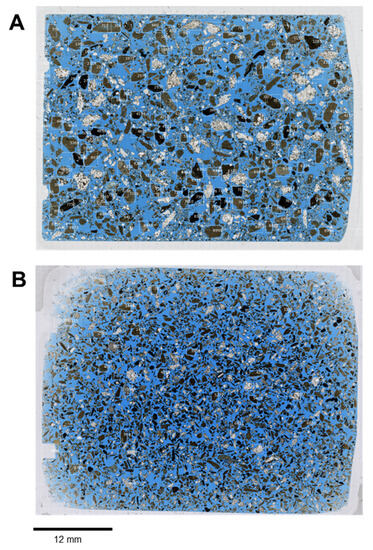 Automatic high-resolution scans of the thin sections were conducted using a Zeiss Axio Scan.Z1 whole slide image scanner (Oberkochen, Germany), employing plane polarized light illumination (PPL) at a 10× magnification. The resulting scanned images of the entire thin sections were gigapixel images, comprising multi-resolution image pyramids, with a maximum resolution of 0.44 microns per pixel. Each thin section scan was completed in less than 10 min.