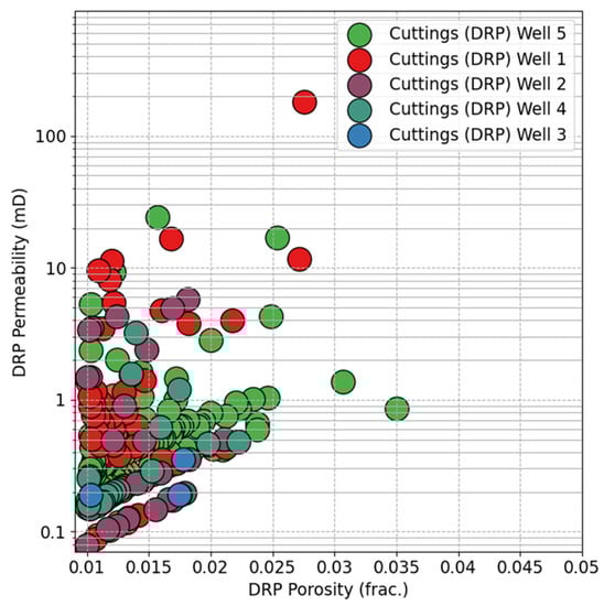 Porosity and permeability properties were obtained using the DRP workflow on the real cuttings (Figure 10), revealing a continuous trend of porosity and permeability values from low to relatively high.