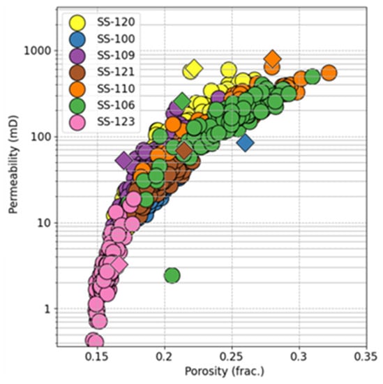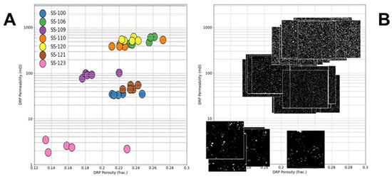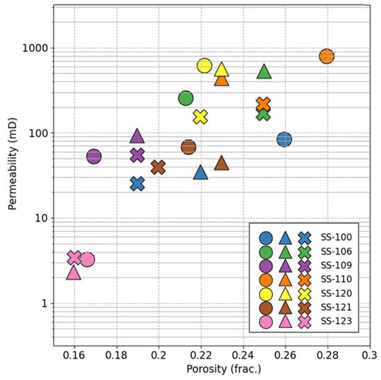 Porosity and permeability results obtained from the application of the DRP workflow on pseudo-cutting samples are presented in Table 4. These results exhibit a continuous trend of values ranging from relatively low to relatively high (Figure 8). A total of over 800 porosity and permeability points were obtained for the seven studied sandstone samples, with more than 100 measured points per sample (see Supplementary Materials Table S3).