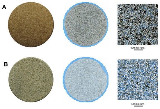Comparison of plug photography (left), high-resolution thin section scan of plugs (center), and cropped area photomicrograph for the DRP workflow (right). It is observed that sample SS-100 Bandera Brown (A) exhibits non-homogeneous composition and texture, in contrast to sample SS-110 Castlegate (B). Plug samples have a diameter of 1.5 inches.