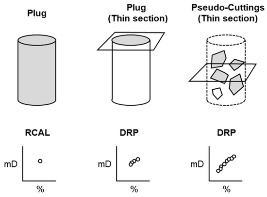 Illustration depicting the comparison between different sample types (plug, thin section, and pseudo-cuttings) and the measurement/computation of porosity and permeability using RCAL and DRP. The shaded area represents the region or volume where the property (conceptually) is measured or computed.