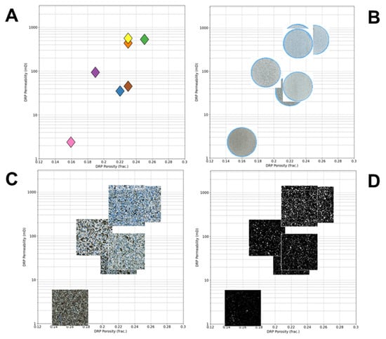 Example of average porosity and permeability values obtained by DRP in plugs (A), high-resolution thin section scan images ((B); 1.5 inches in diameter), cropped areas (C), and segmented areas ((D); 500 × 500 microns).