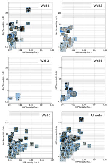Hundreds of cuttings were identified and extracted from each thin section for the application of the DRP workflow in order to obtain porosity and permeability properties (Figure 6 and Figure 7).