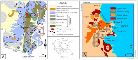 (A) Simplified geological map of Lavrion area (with modifications after) [32,33,34,35]. (B) The locations and types of the mining and processing wastes dumped in the broader area of Lavrion city during the past 160 years (with modifications after) [14,36,37].
