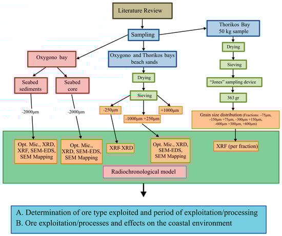 The flow chart of the methodology employed in this study is depicted in Figure 2. A total of 13 beach sand samples were collected from Oxygono Bay (samples OB1 to OB8; Figure 3A) and the southern part of Thorikos Bay (samples TB1 to TB5; Figure 4A) in two sampling periods (February and September 2019). The specific sites were selected because they are located very close to former processing facilities and were also used as waste disposal sites. Specifically, 2–3 kg of sample was collected from a depth of 20 cm from the surface with the use of a small shovel (Figure 3C and Figure 4C). At the lab, pebbles of lithic clasts as well as plant parts were removed by hand, and the samples were placed on aluminum plates and dried at room temperature. The dried samples were examined under the stereoscope, and the −1000 μm fraction was the most promising and was selected as the grain size threshold for mineralogical and geochemical analyses. Following, the beach sands were dry sieved at the lab of the Section of Geological Sciences, School of Mining and Metallurgical Engineering, National Technical University of Athens, and were separated into the following sieve fractions: +1000 μm, −1000 + 250 μm, and −250 μm. The fraction −250 μm was further ground with agate mortar for XRD and geochemical analyses, whereas the −1000 + 250 μm fraction was used for thin section and polished block preparation for mineralogical and mineral-chemistry analyses (Figure 2).