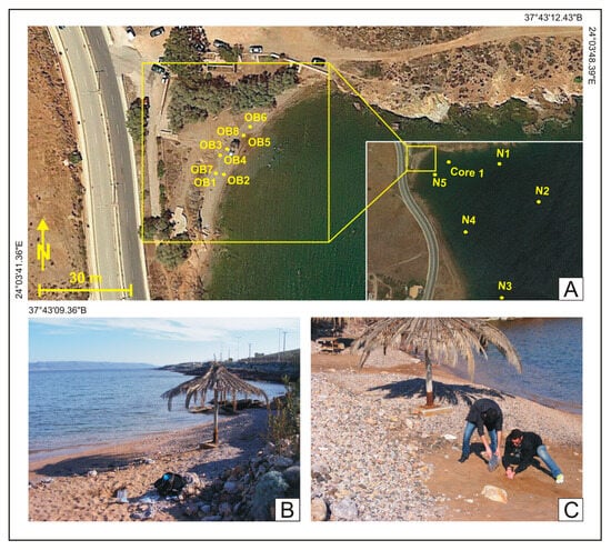 (A) Google Earth image of Oxygono Bay with the corresponding beach sand sampling points (OB1 to OB7), seabed sediments (N1 to N5), and the seabed core (Core 1). Samples N1 to N5 and Core 1 are from Pappa et al. [20]. (B,C) Field photos of Oxygono Bay where the poor sorting is evident.