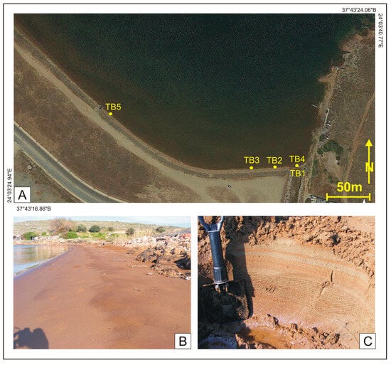 (A) Google Earth image of Thorikos Bay and the corresponding beach sand sampling points (TB1 to TB5). (B) Close-up photo of the beach sands at Thorikos Bay where natural, temporal enrichment is evident on the surface. (C) Banding of heavier (e.g., pyrite, brown-gold color) relative to lighter (mainly Fe-oxides/hydroxides, orange-red color) material is also present with depth.