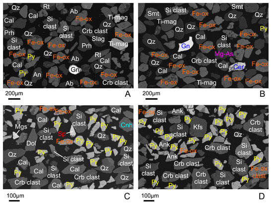 Backscattered electron images of the beach sands from Oxygono and Thorikos bays (−1000 μm + 250 μm fraction). The angular-subangular shape of the clasts is evident. (A,B) Beach sands from Oxygono Bay with Fe-oxides/hydroxides (Fe-ox) and lithic fragments, including carbonate (crb-clast) and silicate (Si-clast) clasts, predominating. (C,D) Beach sands from southern Thorikos Bay, where the abundance of angular pyrite crystal fragments is pronounced. Abbreviations after [55]: Ab: albite, Ank: ankerite, Cal: calcite, Cer: cerussite, Dol: dolomite, Gn: galena, Kfs: K-feldspar, Mgs: magnesite, Qz: quartz, Prh: prehnite, Py: pyrite, Rt: rutile, Smt: smithsonite, Sp: sphalerite, Cnh: conichalcite, Ti-mag: Ti-magnetite, Fe-ox: Fe oxides/hydroxides, Mg-As: Mg-arsenate, Crb clast: carbonate clast, Si clast: silicate clast, Fe-ox clast: Fe oxides/hydroxides clast.
