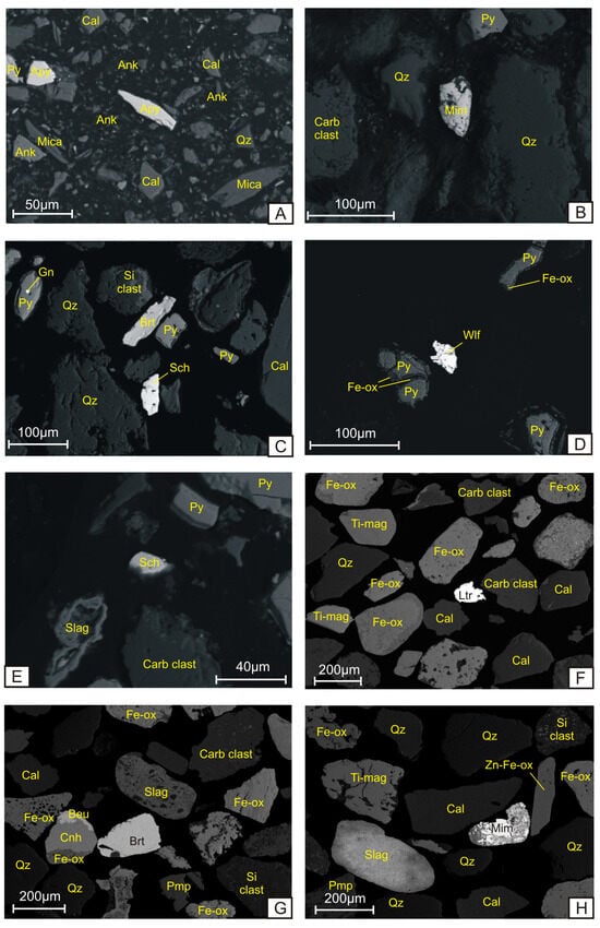 Backscattered electron images of Oxygono Bay heavy mineral phases from the seabed core collected a few tens of meters from the shore (images A–E) and the beach sands (images F–H). (A) Arsenopyrite (Apy) and pyrite (Py) angular fragments (0–2 cm depth from seabed surface). (B) Mimetite (Mim) subangular fragment (14–16 cm depth from seabed surface). (C) Barite (Brt) and scheelite (Sch) angular-subangular fragments (14–16 cm depth from seabed surface). (D) Wolframite (Wlf) subangular fragment (14–16 cm depth from seabed surface). (E) Scheelite (Sch) subangular fragment (30–32 cm depth from seabed surface). (F) Subangular litharge (Ltr) fragment, Ti-magnetite (Ti-mag) and Fe-oxide/hydroxides (Fe-ox) from Oxygono Bay beach sand (sample OB6). (G) Angular-subangular barite (Brt), subangular secondary phases clast with Fe-oxides/hydroxides (Fe-ox), conichalcite (Cnh) and beudantite (Beu) from Oxygono Bay beach sand (sample OB6). (H) Mimetite (Mim) subangular clast, Ti-magnetite (Ti-mag) and slag fragment from Oxygono Bay beach sand (sample OB6). Abbreviations after [55]: Ank: ankerite, Apy: arsenopyrite, Beu: beudantite, Brt: barite, Cal: calcite, Cnh: conichalcite, Ltr: litharge, Mim: mimetite, Qz: quartz, Pmp: pumpelleyite, Py: pyrite, Ti-mag: Ti-magnetite, Fe-ox: Fe oxides/hydroxides, Sch: scheelite, Wlf: wolframite, Carb clast: carbonate clast, Si clast: silicate clast, Fe-ox clast: Fe oxides/hydroxides clast.