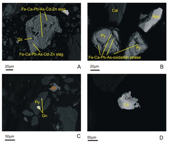 Backscattered electron images of processing and smelting wastes from Oxygono Bay seabed and beach sands. (A) Slag fragment from the surface of the seabed sediment (Core 1, 0–2 cm interval). (B) Pyrite (Py) angular fragments showing signs of post-disposal weathering, whereas arsenopyrite (Apy) fragment remains fresh. The pyrite fragments are weathered to an unidentified secondary Fe–Ca–Pb–As phase (Core 1, 14–16 cm interval). (C) Galena (Gn) inclusions in pyrite (Py) fragment, indication of poor ore processing (Core 1, 30–32 cm interval). (D) Litharge (Ltr) fragment weathered to cerussite (cer) after disposal (sample OB6). Abbreviations after [55]: Apy: arsenopyrite, Cal: calcite, Brt: barite, Gn: galena, Ltr: litharge, Qz: quartz.