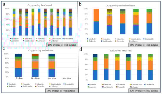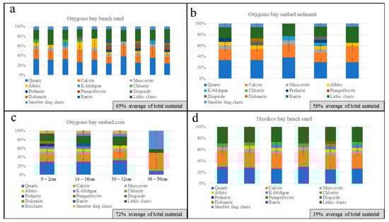 Histograms with standard error bars of gangue phases, lithic, smelter clasts and bioclasts of Oxygono bay beach sands (a), Oxygono bay seabed sediment (b), Oxygono bay seabed core (c) and Thorikos bay beach sands (d). The percentage of the corresponding fraction relative to total fine-grained material examined is also given. Results after scanning electron microscopy point counting.