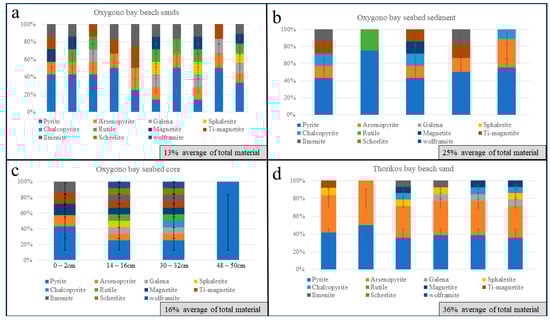 Histograms with standard error bars of ore and metal-bearing phases of Oxygono bay beach sands (a), Oxygono bay seabed sediment (b), Oxygono bay seabed core (c) and Thorikos bay beach sands (d). The percentage of the corresponding fraction relative to total fine-grained material examined is also given. Results after scanning electron microscopy point counting.