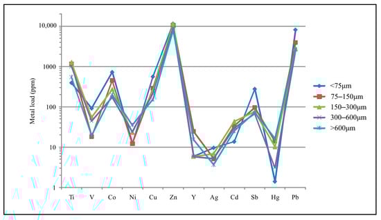 The beach sands from Thorikos Bay are characterized by elevated heavy metal loads and relatively high LOI values (17.9% average; Table 2). The metal content of the Thorikos Bay beach sands is higher with decreasing grain size (Table 3), ranging from 2.1% for the −75 μm fraction, to almost 1.1% for the +600 μm fraction. All fractions present similar trends regarding their metal load (Figure 11).