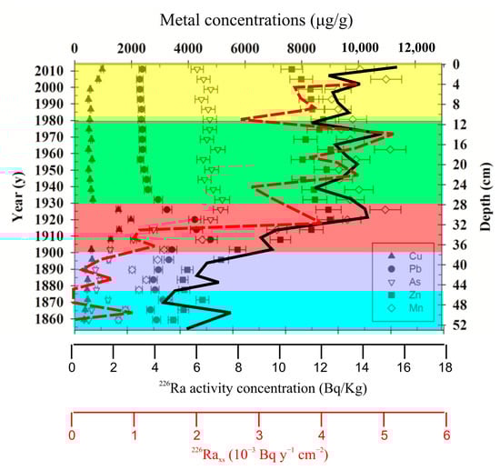 Correlation of the temporal model of Pappa et al. [20] relative to the ore type exploited and the processing technology involved for Oxygono Bay. The226Ra concentration of the seabed sediments is also depicted (black line: total 226Ra concentration, red dashed line: excess 226Ra concentration). Period 1860–1875 (blue color, depth 46–52 cm): Exploitation of ancient, abandoned smelter slags after production of Ag and Pb. Period 1875–1900 (purple color, 37.5–46 cm): First attempts of primary sulfide ore exploitation (carbonate hosted massive sulfides). Period 1900–1930 (red color, depth 28–37.5 cm): The heavy metal content of the seabed core gradually increases (particularly Zn and Mn). Period 1930–1980 (green color, depth 11.5–28 cm): Stable metal content of the seabed during this period 1980–2014 (yellow color, depth 0–11.5 cm): The metal content is rather stable, whereas only As and Zn show a relative decreasing trend. With modifications after [20].