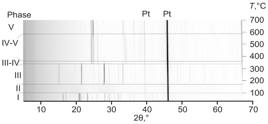High-temperature X-ray diffraction (HTXRD) patterns of boussingaultite and its high-temperature derivatives: (I) boussingaultite (NH4)2Mg(SO4)2·6H2O, 25–90 °C; (II) X-ray amorphous phase, 100–150 °C; (III) efremovite (NH4)2Mg2(SO4)3, 160–340 °C; (IV) MgSO4 (Cmcm), 340–580 °C; and (V) MgSO4 (Pbnm), 340–700 °C.