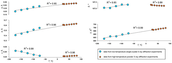 The unit-cell parameters of boussingaultite were refined for seven temperatures in the high-temperature region from 25 to 90 °C, in addition to the low-temperature SCXRD region, with five values in the temperature range from −173 to −73 °C. As shown by Figure 2 for the unit-cell parameters a and b and the unit-cell volume, V, the dependencies of lattice parameters versus temperatures show linear approximation for both low- and high-temperature regions. The c lattice parameter undergoes contraction in the low-temperature region and expansion in the high-temperature region (approximated by two linear dependencies).