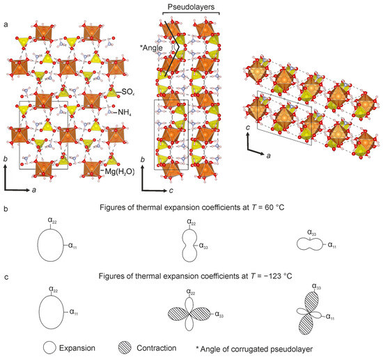 The crystal structure of boussingaultite (a) and the figures of thermal-expansion coefficients at 60 °C (b) and −123 °C (c). * Angle corresponds to corrugated angle (see text).