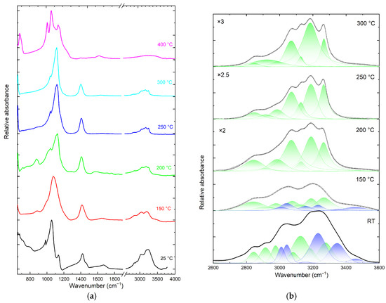 Raman spectra were obtained using the Horiba LabRam HR800 Evolution spectrometer equipped with the confocal Olympus BX–FM microscope, Ar laser (radiation wavelength of 488 nm), and the Linkam TSM 600 heating/cooling stage. A diffraction grating of 1800 gr/mm and an electrically cooled CCD detector were used for recording. The spectrometer calibration was guided along the Rayleigh line and the emission lines of a neon lamp. The spectral resolution was about 1 cm−1. The spatial lateral resolution was about 1 μm. The temperature-dependent spectra were collected during the heating of the sample in the temperature range from −190 to 500 °C, with a step of 1–10 °C (depends on temperature range); the exposure time of the sample to stabilize the temperature was 20 s. The heating rate was 20 °C/min. The accuracy of maintaining the temperature was 0.1 °C. The temperature-measurement range is limited due to the increasing photoluminescent background from the sample. The peak fitting procedure was carried out using LabSpec6 software, ArDI web-application [38], and Origin 2020 by approximating spectra with Voigt contours. The background was subtracted by a third-order polynomial, each spectrum in the equation has its own characteristic coefficients.