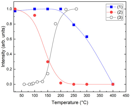 The temperature dependences of integral intensities of bands relayed to NH4 bending (curve 1) and O–H stretching bands (curve 2). Curve 3 is the intensity of luminescence registered in Raman spectra of the heated sample.