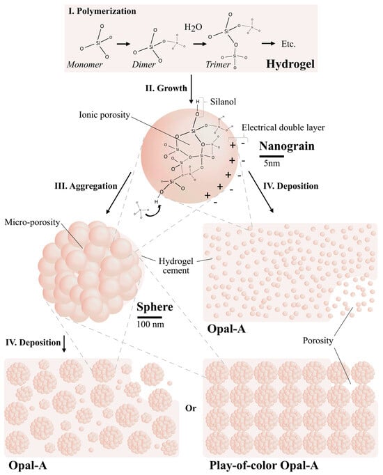 However, this scenario for opal formation has not been extensively tested yet in the laboratory. Several attempts to synthetize opal have been conducted, and the resulting products share some similarities with natural opal, but none of the synthesis methods have used geologically relevant compounds or conditions. The most commonly used method, established by Stöber in the late 1960s [49], is based on the hydrolysis of tetraethoxysilane (TEOS) in organic solvent with ammonia. Recent adaptations of this method mainly used organic compounds as the main solvent [50,51,52,53,54,55], or more exotic routines involving high-temperature or high-pressure conditions [56,57,58]. The synthesis of silica spheres with diameters ranging from 150 to 300 nanometers opened the way for the synthesis of colloidal photonic crystals mimicking the visual play-of-color of natural opal. The synthesis of silica nanograins and spheres is now widely studied, and several methods have been developed for applications in various domains, such as chemistry (e.g., catalyst bases), textile and papers (e.g., pigments and latex–foam products), medicine (e.g., drug delivery), etc. [42,59,60,61]. However, the syntheses developed in these studies are unrealistic for geological contexts and conditions. For example, the spheres are grown in organic compounds (ethanol or others) as the main solvents, whereas the main solvent on the Earth’s surface remains water.