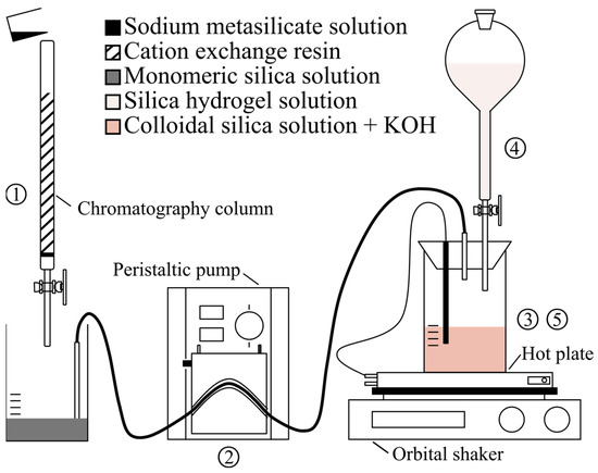 A total of 14 g of sodium metasilicate (Na2SiO3) was dissolved in 100 mL of ultrapure water and passed through a 300 mL column filled with cation exchange resin. The resulting silicic acid solution (1.456 mol/L of Si(OH)4; pH = 3) was then stored for 2 to 3 h at room temperature (Figure 2, part 4).
