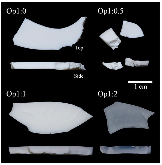 The samples are white and did not show any play-of-color. Figure 4 shows photographs of the top and side of the synthesized sample fragments. When increasing the volume ratio of the hydrogel solution in the synthesis, the samples become more transparent and smoother to the touch. Most of the samples containing hydrogel show an increasing in transparency from the bottom to the top. Op1:1 shows a homogeneous translucent white appearance. Soaked in water, all the samples become colorless and transparent. This phenomenon, observed in some natural opals, is referred to as the “hydrophane” character in the geological and gemological literature [18]. The white color is due to the presence of pores that scatter the visible light. This optical phenomenon is fully reversible by re-drying the solid at room temperature and does not alter the brittleness of the opal. The optical transition from translucent to transparent takes a few seconds for the samples with low hydrogel content (Op1:0.5) or no hydrogel (Op1:0), and about one minute for the samples with higher hydrogel content (Op1:1, Op1:2).