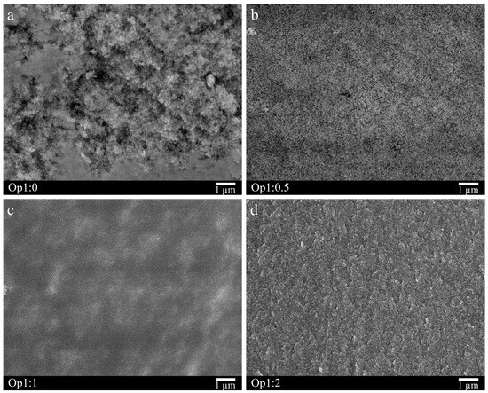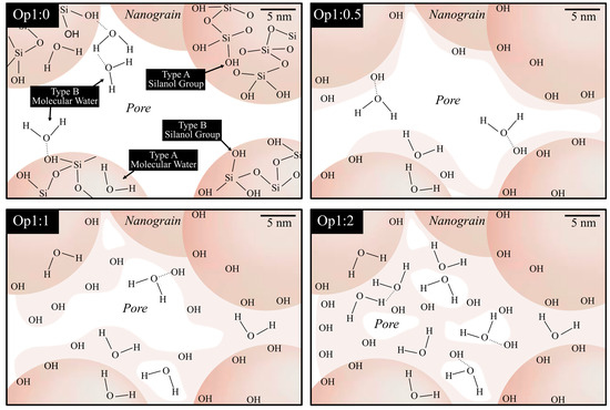 Figure 5 shows SEM microphotographs of the fresh break surfaces of the four samples. All the samples show rounded silica nanograins with diameters between 25 and 40 nm (a closer view is given in Figure 6 for Op1:1, as an example), consistent with the DLS measurements. Without the presence of hydrogel cement (Op1:0, Figure 5a), the nanograins are remarkably well visible, and chaotically arranged in more or less compacted regions. In all the samples, the nanograins tend to coalesce into larger aggregates, protospheres (50–300 nm) composed of a few joined nanograins (Figure 6). The incorporation of hydrogel increased the amount of spherical structures in the synthesized products. Hence, the protospheres are no longer simply fused at the nanograin interfaces, but also cemented by the hydrogel (Figure 6). By increasing the volume ratio of the hydrogel solution, the products contain fewer visible large mesopores and the observed surface becomes much smoother and more homogeneous (Figure 5b,c). The hydrogel seems to act as a porosity filler and so a cement of the solid material composed of nanograins, as shown in Figure 6.