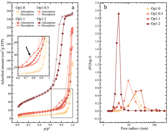 (a) Nitrogen adsorption (full symbols) and desorption (open symbols) isotherms measured at 77 K for the four samples. The black arrow points to a change in the slope of the desorption branch of Op1:1 that can be attributed to the onset of a new pore. (b) Pore radius distribution curves of the four samples.